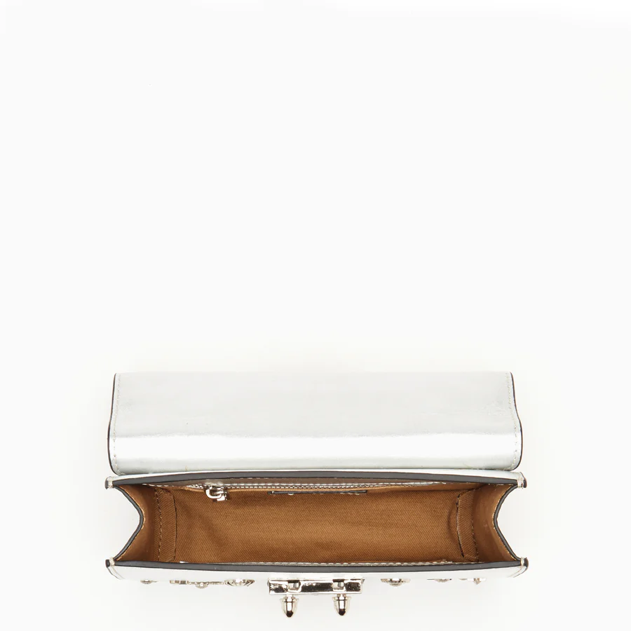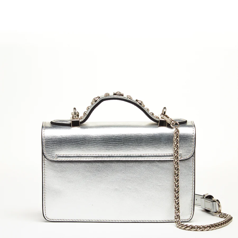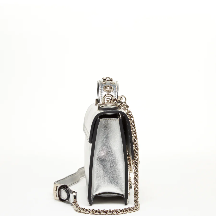 This studded silver leather crossbody bag is the perfect accessory to elevate your style. The high-quality leather construction and silver studs add a touch of glamour and edge to the sleek and stylish design. The adjustable chain link strap allows for comfortable wear as a crossbody, and the fully lined interior can hold your phone and other essentials. The silver hardware gives the purse a luxury touch, making it perfect for both casual and dressy occasions. Whether running errands or hitting the town, this small leather purse will add a touch of sophistication to any outfit.  It's an amazing evening bag, great for attending a party, wedding and a date night.